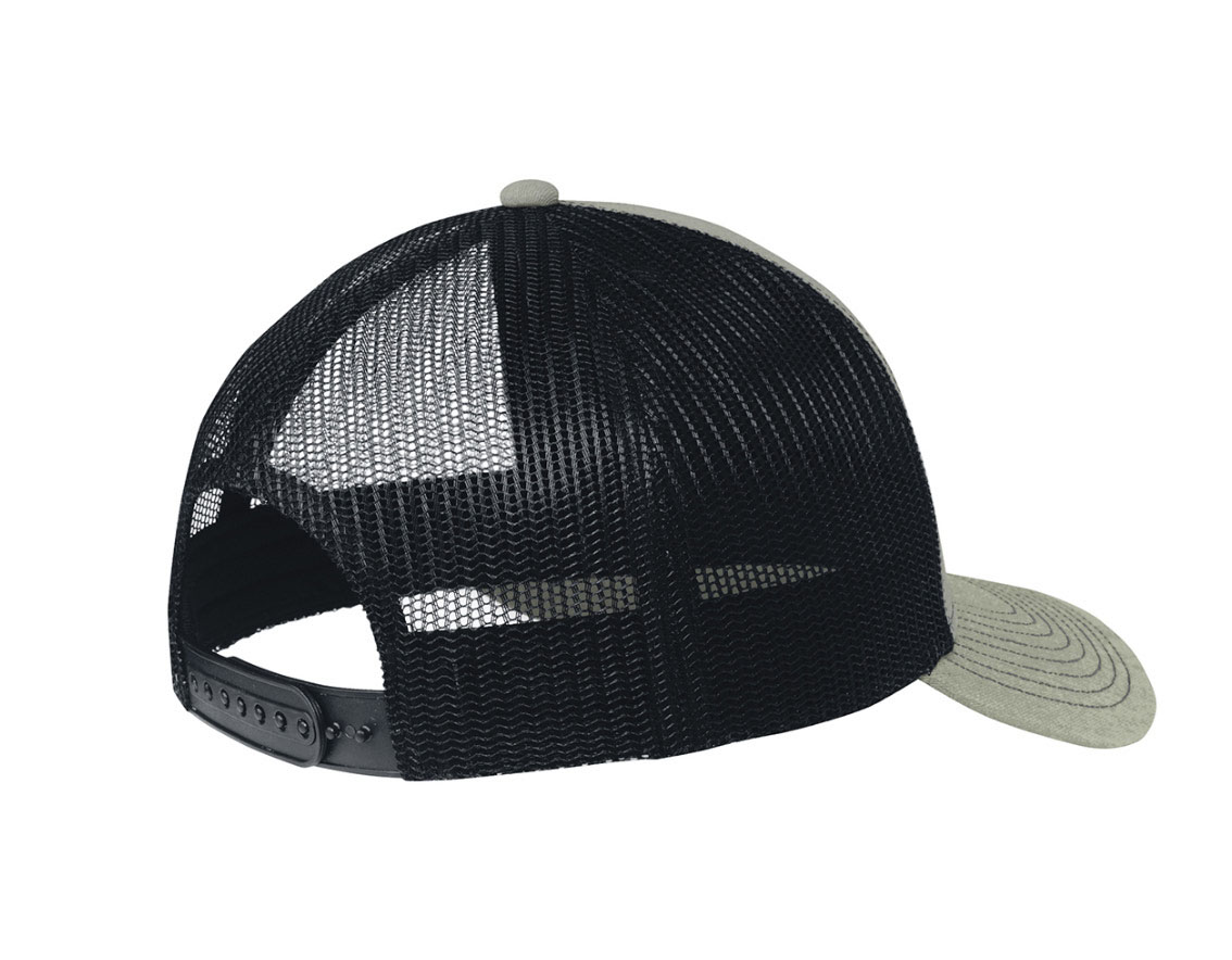 - 100% cotton twill front panels and bill (Solids); 65/35 polyester/cotton twill front panels and bill (Heathers); 100% polyester mesh mid and back panels